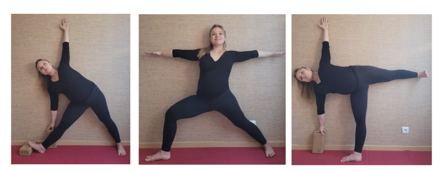 La majorité des postures debout peuvent être pratiquées avec le pied arrière contre le mur : dans ce cas là il permet d’activer et enraciner la jambe arrière. Par exemple dans Utthita Trikonasana.