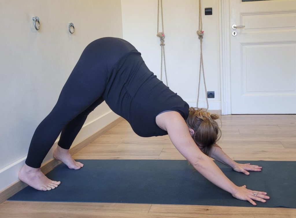 Dans le cadre du mentorat, il nous a été demandé de choisir un support et de le décrire. J’ai hésité entre la sangle, le bolster et le mur. J’ai finalement opté pour le mur, choix, orienté par ma condition actuelle2 de femme enceinte. Ce support m’a accompagné ces derniers mois et s’est révélé salutaire dans ma pratique : il m’a permis de rester dans les postures plus longtemps et aussi de me concentrer pleinement sur certains parties du corps en allégeant les effets de la gravité et de l’équilibre.